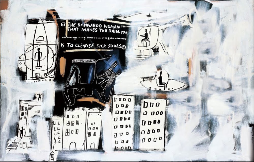 Jean-Michel Basquiat, negro, filho de haitiano, criado pobre, mas então já famoso, morreu em agosto de 1988 de overdose. Em oito anos deixou uma obra extensa, raivosa, intensa e, sobretudo crítica. As figuras negras triunfais, o boxeador vitorioso, as imagens de repressão e libertação, anotações sobre a pobreza e palavras tortas anotadas de forma obsessiva muitas vezes pela tela quase toda, são motivos recorrentes. Avesso ao status-quo, revirou o cenário artístico de sua época em um momento em que as galerias começaram a ser invadidas pela arte das ruas.